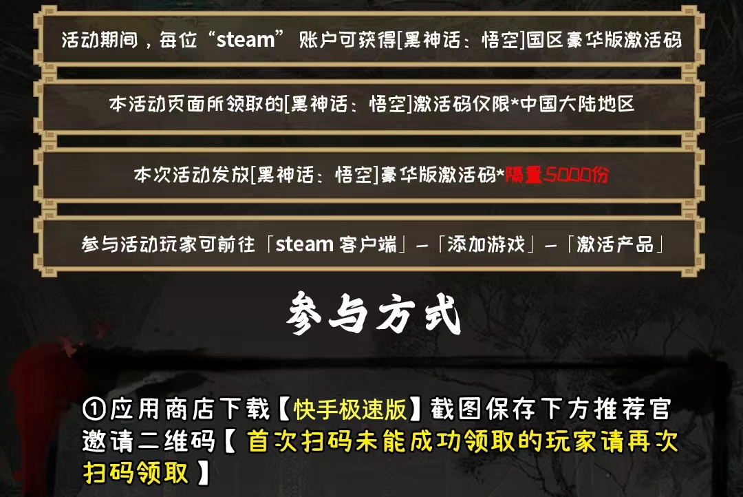恭喜您,获得《黑神话:悟空》豪华版版激活码 L5P7R-9T1Y3-U5A7S 请前往steam客户端内「添加游戏」-「激活产品」进行兑换